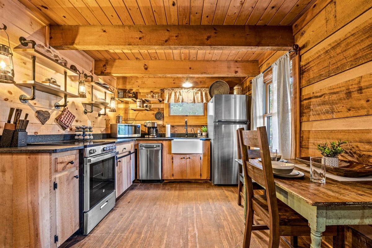 Let the long gravel driveway transport you back to a time. This chic newly remodeled cabin has a flare of the past with the luxuries of modern time. The stocked kitchen is ready for a home-cooked meal. The open meadow in the front is a perfect space to enjoy nature. This quaint one-bedroom lodge has everything you need to relax and reset with the one you love.