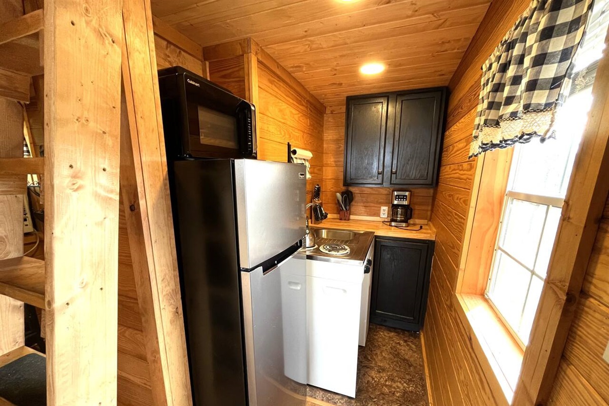 This tiny house is all of 200 sq ft with a ladder to the loft bed and a pull-out futon. Being that every space in this house is utilized there is no sink in the bathroom making the kitchen sink "the SINK". House is located on a steep driveway with a flat parking surface at the top of the hill. This place although small brings a warm and welcoming atmosphere. Cozy up near the electrical fireplace on those chilly nights, or read a book on the porch hammock.